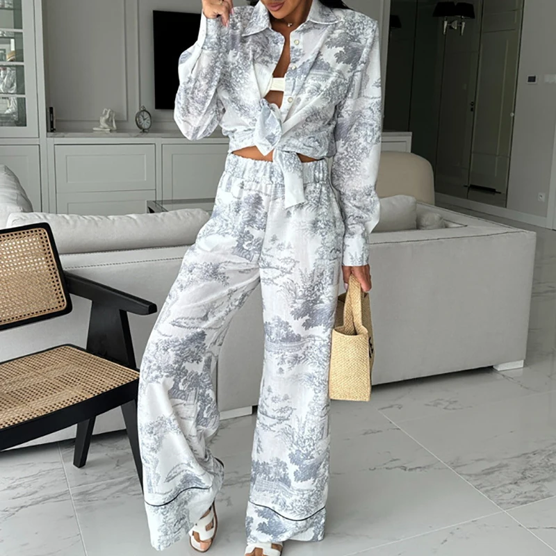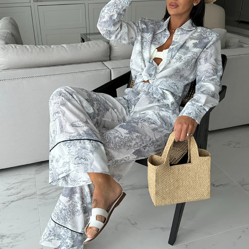 Women Causal Long Sleeve Loose 2Pc Sets Vintage Pattern Printed Office Outfits 2024 Fashion Lapel Collar Shirt & Long Pant Suit