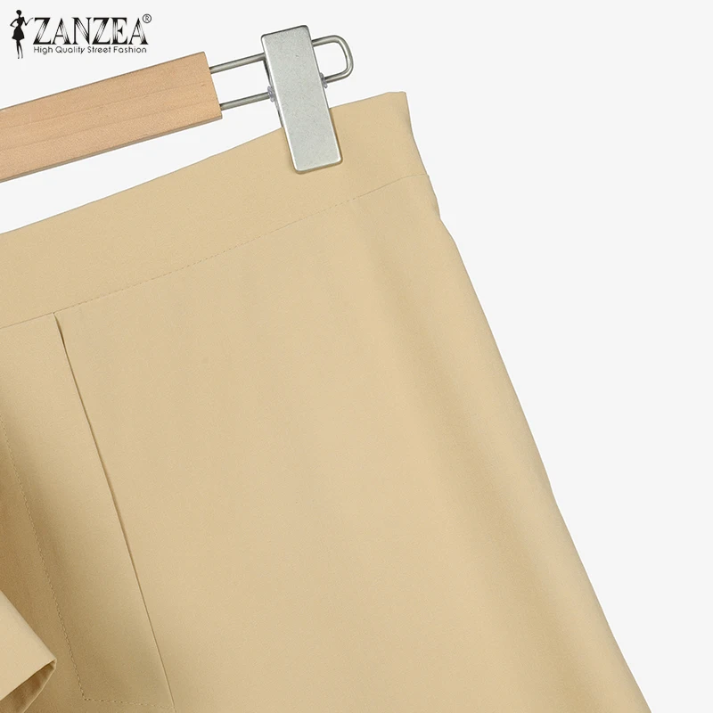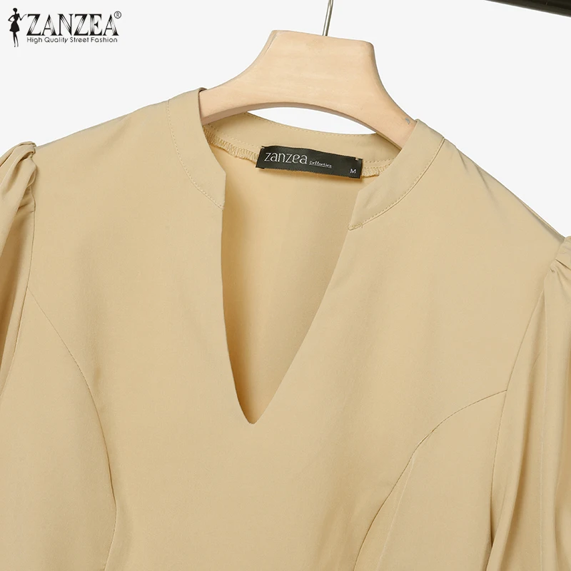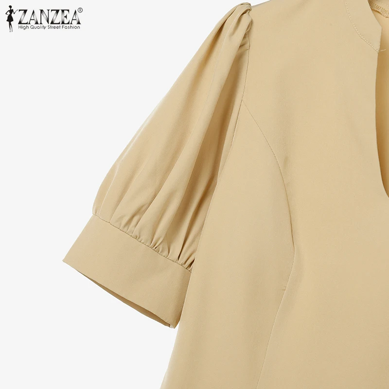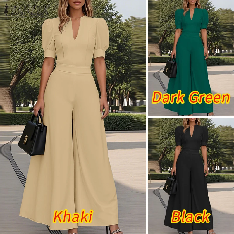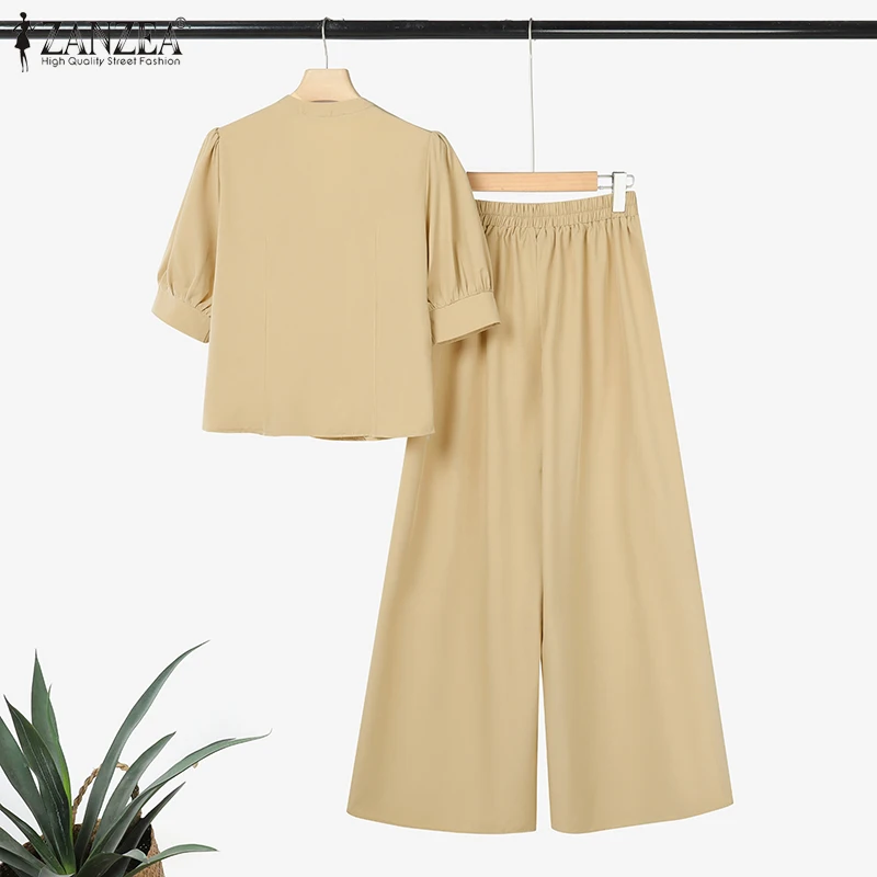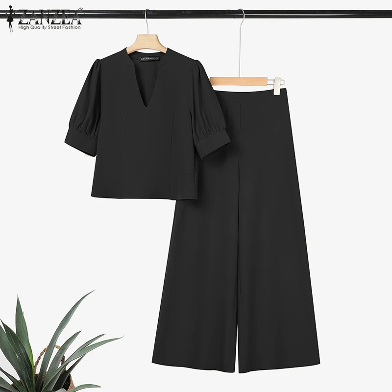 ZANZEA Stylish Summer 2 Piece Sets Women Outfits Fashion OL Work Tracksuit Elegant V-Neck Puff Sleeve Blouse Wide Leg Pant Suit